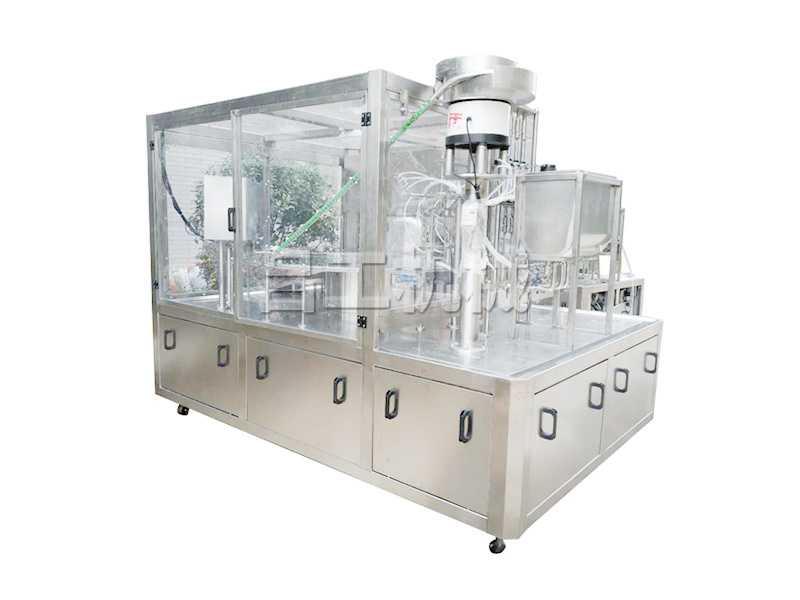 特点:本机从自动定位—自动吹气—自动定量两次灌装—自动清洗—自动下盖—自动旋盖—自动出袋